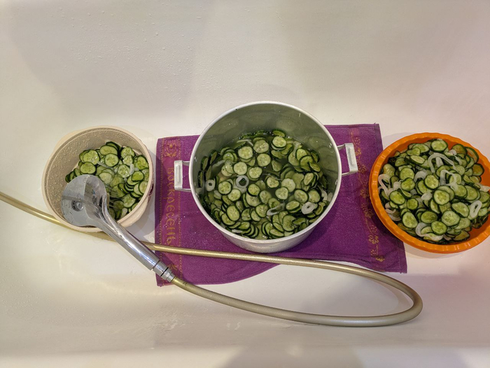Вся эта перда даёт много сока и он даже может политься через край ёмкости, поэтому ванна или раковина - лучший выбор. Солиться оно должно целых 3 часа! Да, ребята, долго, но оно того стоит. Спустя 3 часа мы промываем от соли наш замес. Тут главное не вымачивать, а просто промыть в дуршлаге до того состояния, когда вам комфортно по соли. Душ или кран вам в помощь. Просто пробуйте на вкус огурцы после промывки.