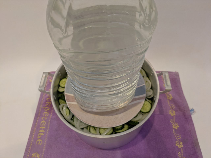 Пересыпаем всё это дело солью, перемешиваем, жмякаем, но без фанатизьма, не как квашеную капусту. Затем водружаем сверху гнёт.