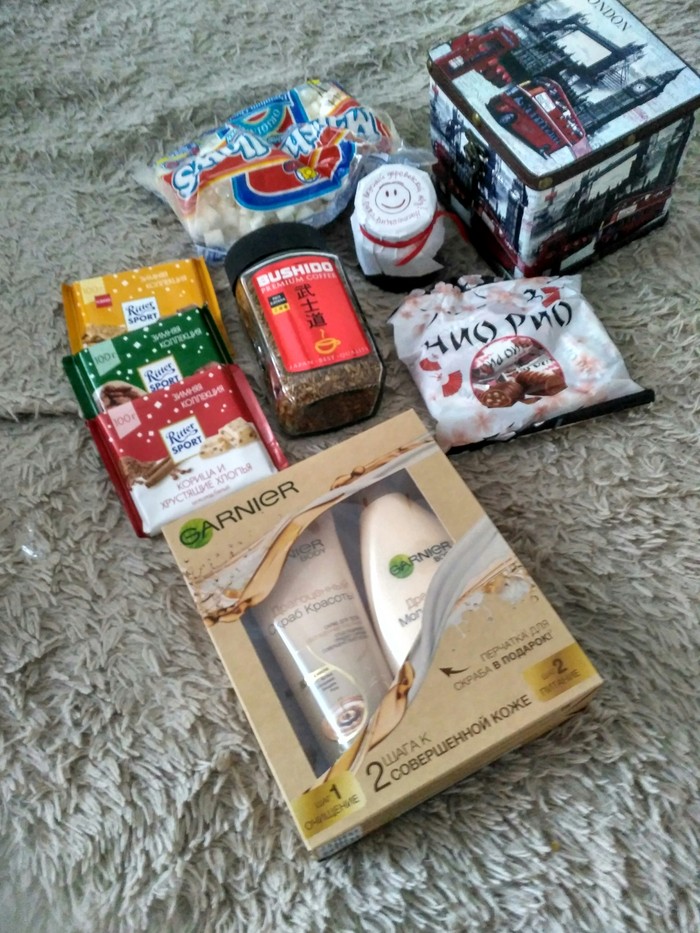 Открываю - и уже прям сразу радостно))) потому что масочки мои любимые (панда-маска особенно! Блииин, в канун НГ это как никогда актуально))) там ещё кремы для лица и для рук, новогодняя атрибутика и прочие девочкины радости)