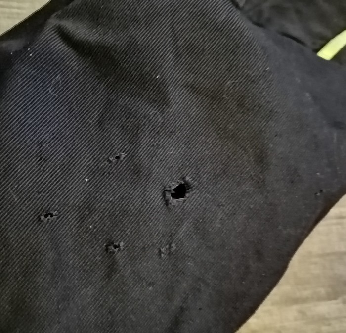 А вот что действительно оказалось сюрпризом, это то, что при соблюдении всех правил ухода и эксплуатации, на рукаве и на штанине очень быстро образовались сквозные дыры.