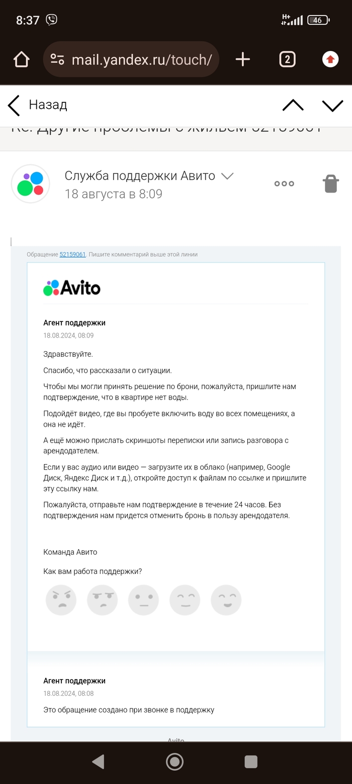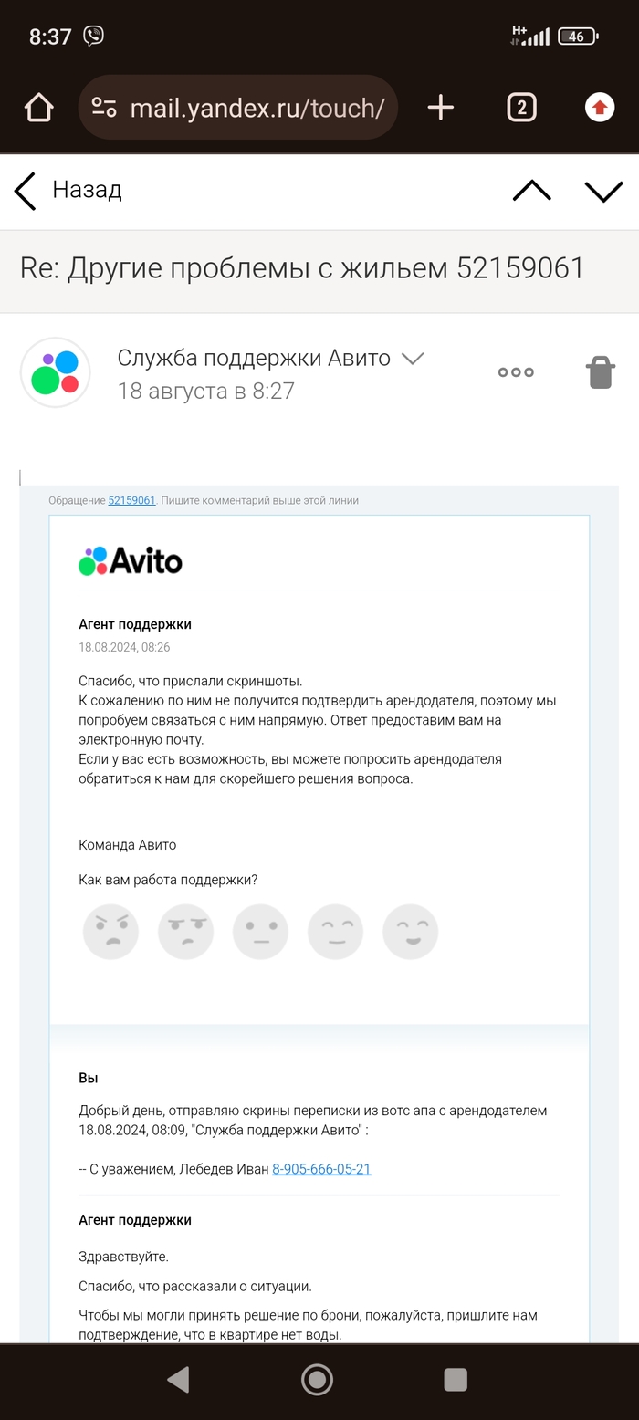 В этом году запланировал поездку на юг на машине с заездом в Краснодар. Нашёл на Авито квартиру, внёс предоплату через Авито. За сутки перед заселением арендодатель написал в WhatsApp что в квартире отключили воду и принять меня не сможет, скрины ниже: