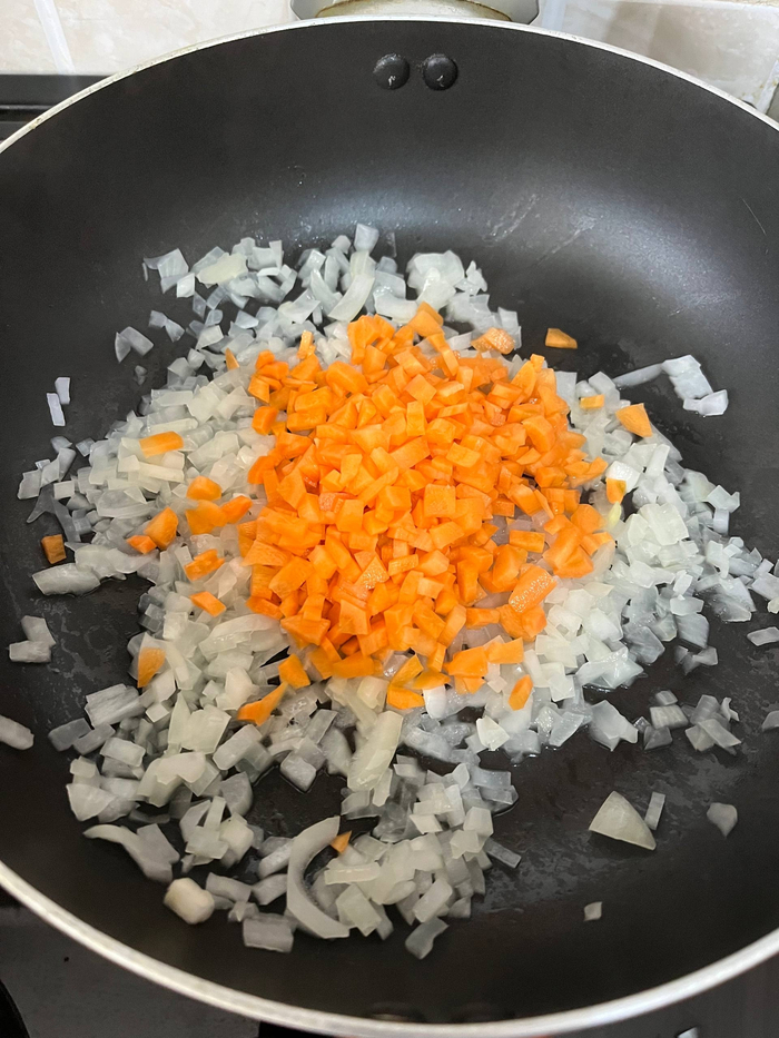 Лук кубиком, морковь тоже. Я криворукий, поэтому как получилось, так получилось. Отправляем пассироваться лук, после получения им прозрачности - добавляем морковь.