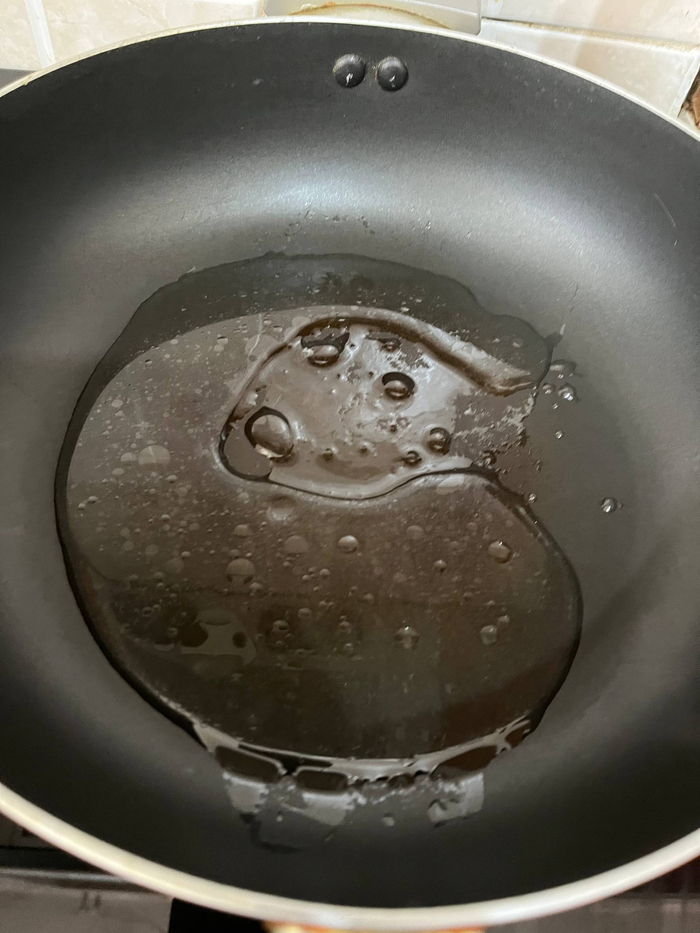 Снимаем верхний слой с бульона и отправляем на сковороду, можете и масла налить, но немного.