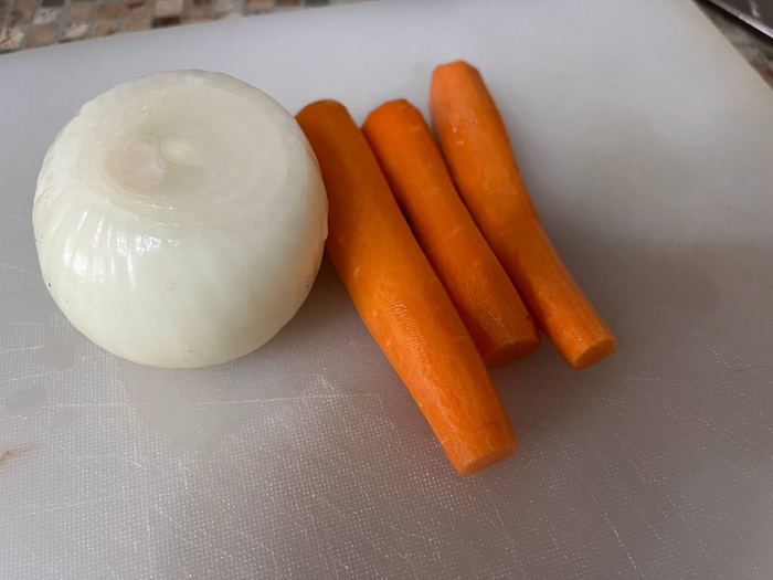 Второе на что обращаешь внимание в супе. Нарезка. Она должна быть однородной, не надо пытаться все делать в разнобой. Ко вкусу это отношения не имеет, но при употреблении, есть диссонанс. Из овощей у меня лук-морковь. Делал опрос как-то, у себя в вк, стоит ли класть картофель. Большинство ответили "да." Сам тоже часто кладу, но не в этот раз. Можно добавить сельдерей и другие овощи, но я не захотел. Хотелось вкуса обычного бульона.