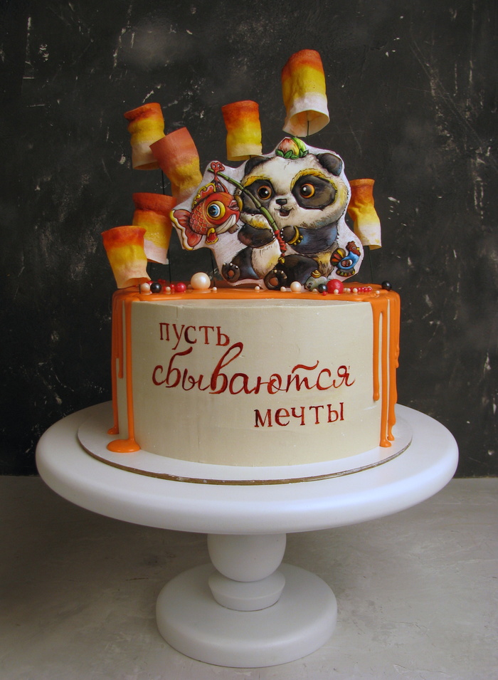 Этого малыша делала на день рождения мужа. Просто милая панда с золотой рыбкой, летающие фонарики и надпись - все для исполнения желаний. Фонари из вафельной бумаги.
