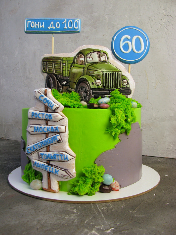 Тут заказали торт для папы, который работал водителем. И на пенсии немного ностальгирует по былым временам, первой машине и дальних поездках. Поэтому машина Горьковского автозавода, указатель примечательных городов и короткое пожелание долгих лет. В оформлении пряники, бисквитный мох, камушки - изюм в шоколаде.