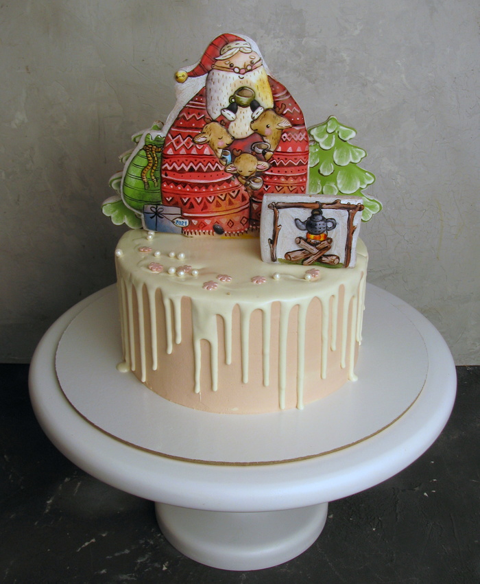 И уютный торт наш семейный на Новогодние праздники. После раздачи подарков дед Мороз (или Санта) отдыхает возле костра с горячим чаем, завернувшись в огромный плед вместе с олешками. Кипит чайник, рядом подарки для любимых и все спокойно и хорошо, будто тебе опять 5 лет и впереди только Счастье.