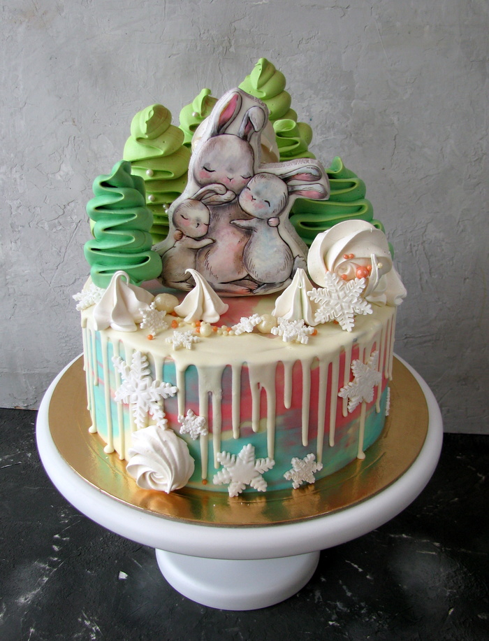 Несколько месяцев ездили с детьми на развивающие занятия. В этом центре все было бесплатно, занятия музыкой, рисованием, логопед, физиопроцедуры, физкультура и бассейн. Работающие там воспитатели и преподаватели просто поразили своей отзывчивостью, спокойствием и терпением. Поэтому захотелось сделать им подарок. Долго думала, с каким изображением сделать торт и все мне не нравилось. И тут попалась эта зайка, обнимающая малышей. Само воплощение нежности. Так как приближался Новый год, добавила ëлочек из безе и снежинки.