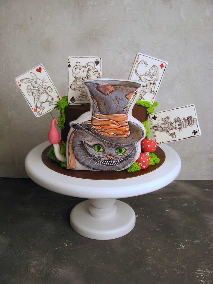 Заказ был на торт по тематике Алисы в стране чудес. Но ни одна из иллюстраций Алисы заказчице не подошла. Поэтому она прислала мне фото Чеширского кота, а в остальном сказала делать "что хочу". Я решила сделать торт, напоминающий пенек, покрыла его велюром на темном шоколаде. Добавила бисквитный мох и мастичные грибочки. Конечно Чешира на передний план. И из мастики сделала разлетающиеся вокруг карты. Съедобная печать, как по мне, не очень спортивно, поэтому рисовала карты вручную.