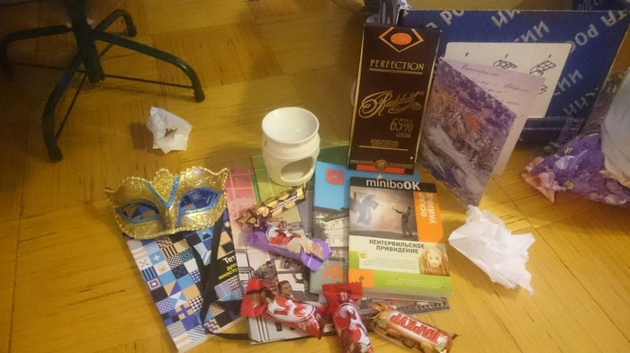 Здесь все прекрасно! И сиропы к кофе и сам кофе, который я очень люблю, и интересные чаи и кружка из которой всё это полагается пить и маски для моего уставшего от ожидания снега лица и носки! Очень необычная вещь наклейки на посуду, которые нужно обжигать в духовке, никогда таких не видела, но специально для них прикуплю тарелок и сделаю! Конечно фэнтези - Пратчет, которого я никак не могла начать читать и вот свершилось! Куча сладостей, печенье с предсказанием, которое будет под ёлкой ждать новогоднюю ночь, планер и очень милая открытка с поздравлением! Даже служебной собаке достались вкусняшки!!!!