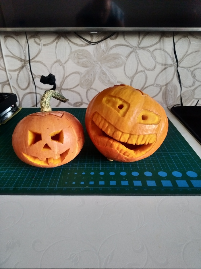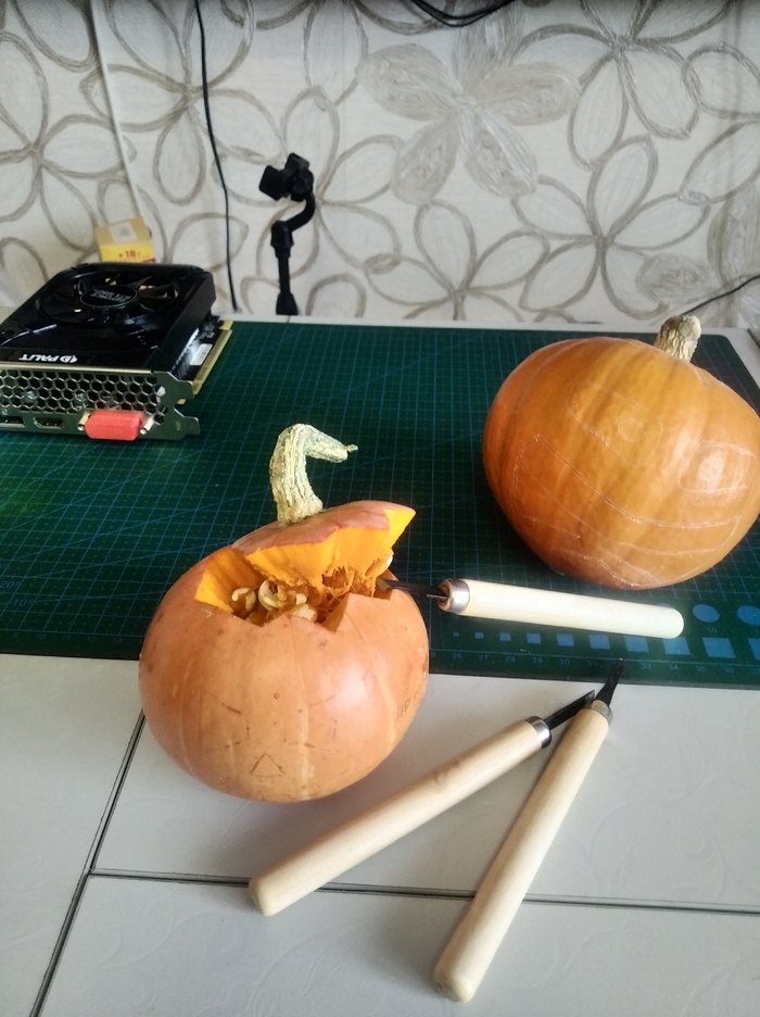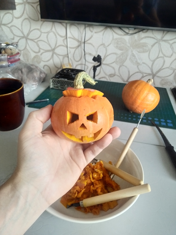 Вырезать можно ножом, но у меня были беспонтовые китайские резцы по дереву. Я ими пользовался, потому что сами тыквы очень маленькие, и хотелось немного детализации.
