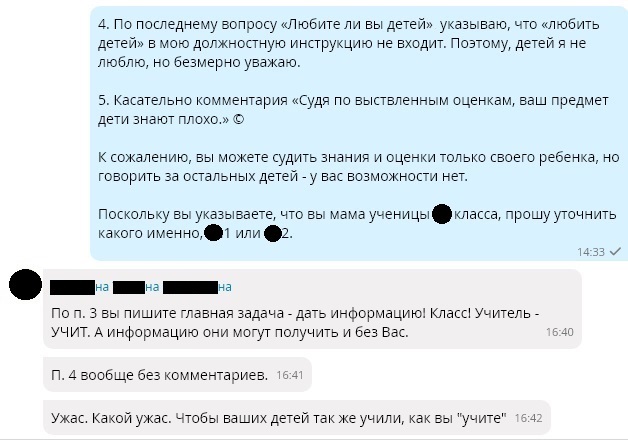 Первое письмо сохранилось на скриншотах. Отвечая, я учитывал, что переписку будут читать те, кому на меня будут жаловаться. Разумеется, на этом дело не закончилось. Меня вызвали на разговор с одной из родительниц в присутствии администрации. Долго выслушивал упрёки в свой адрес, но в конце твёрдо заявил: «Моё сердце занято. Я люблю маму, Родину и пельмени. А еще есть жена, ее обожаю. А вашим детям готов предоставить только уважение — и считаю это более ценным. Я не продаю любовь за зарплату. За кого вы меня принимаете?»