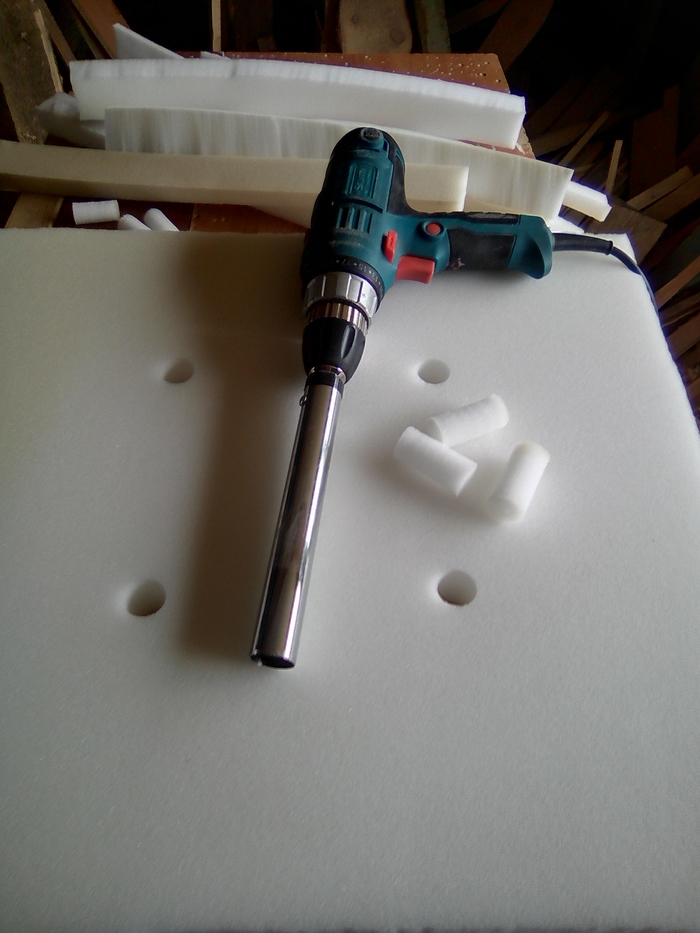 На перо можно приклеить ограничитель из изоленты. Чопик длиной в 10 см подойдёт для кухни, турника и прочего. Отверстие нужно сверлить чуть глубже на пару см. И сверлить сразу с пылесосом, потом пыль будет сложно достать.