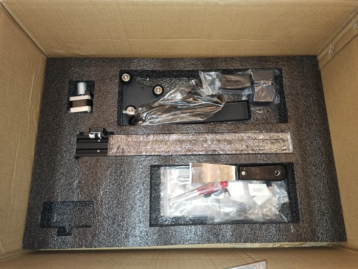 Под ним еще один ярус с двигателем оси Z, двумя алюминиевыми профилями той же оси, кабелем питания и набором инструментов, а так же болтиков и гаек для сборки.
