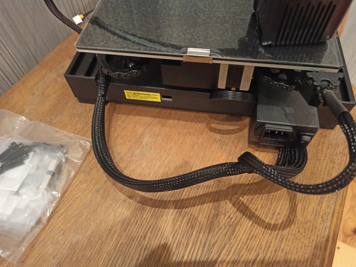 Все провода упакованы в оплетку "змеиная кожа". С принтером в комплекте стекло для стола "ультрабаза". И даже фиксатор для провода питания на столе установили.