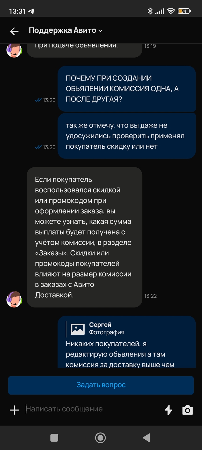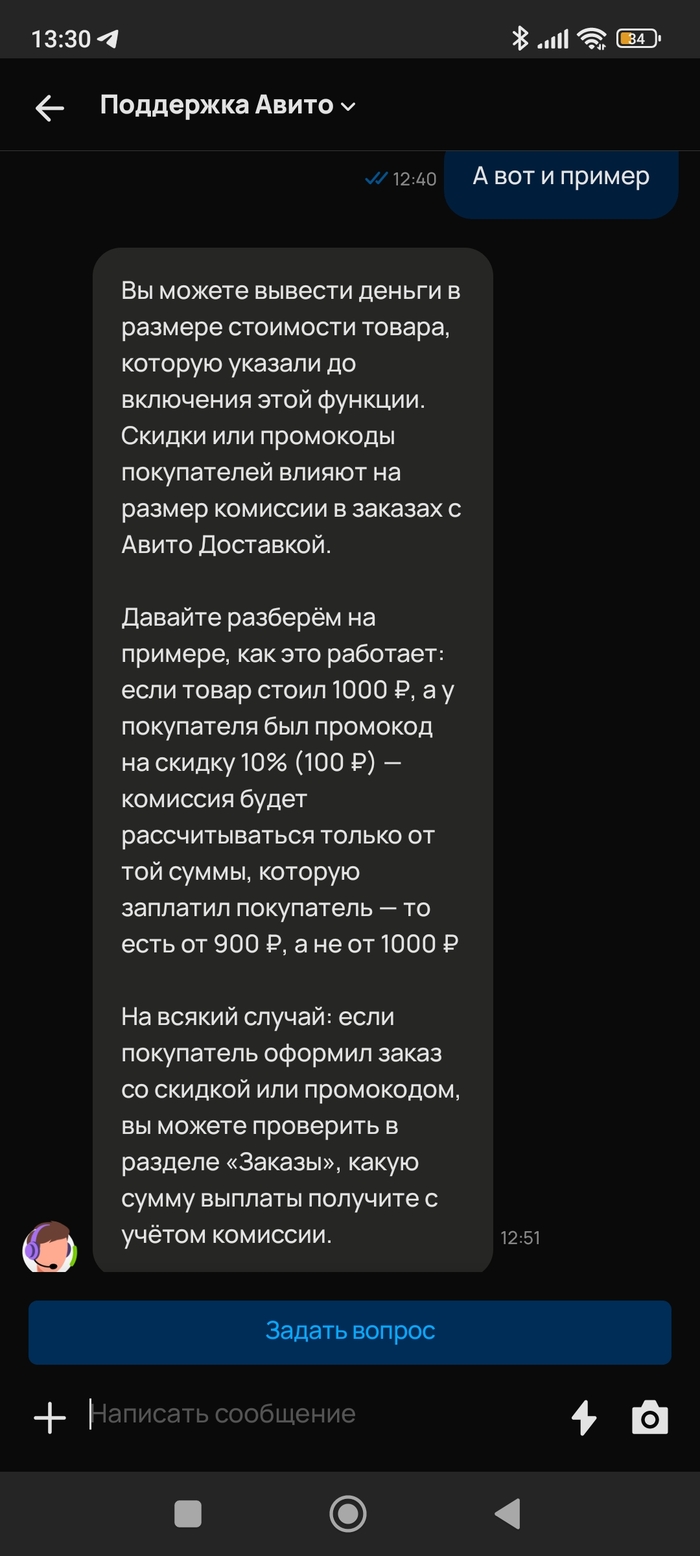 Создал объявление выставил цену 5000 за товар, включаем Авито доставку. И стоимость комиссии на покупателе выходит 5434. Цена ниже рынка и естественно сразу покупают товар. Вот только комиссия за доставку внезапно из изменилась. И теперь получу не 5000, а 4973. Мелочь, но не приятно. Решил узнать в поддержке как так получилось. Пройдя 7 кругов общения с ботом, каким-то не ведомым образом соединило меня с оператором