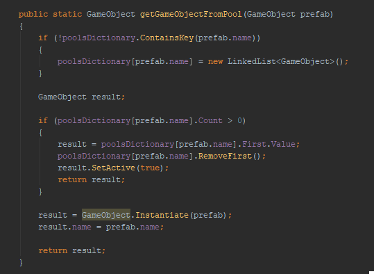 Но благодаря этим небольшим ограничениям, не надо возиться со всякими дополнительными компонентами типа IPoolable и т.д., мой пул очень прост в использовании. Просто вместо GameObject.Instantiate(prefab) вызываешь PoolManager.getFromPool(prefab), А вместо GameObject.Destroy(gameObject) PoolManager.putToPool(gameObject)