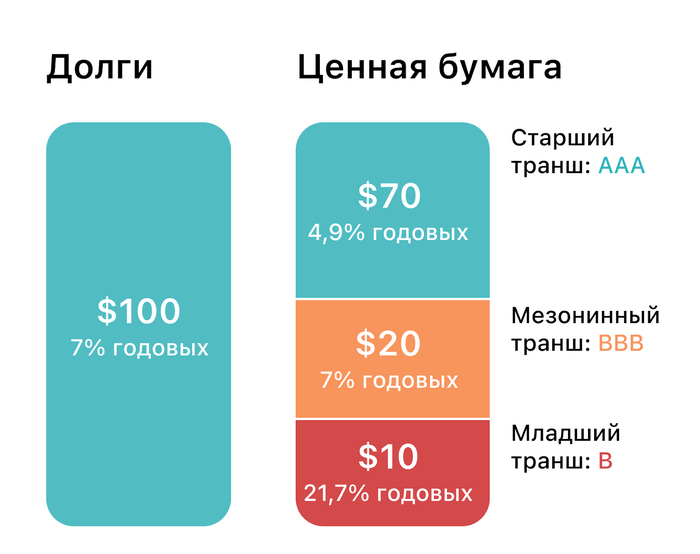 Транши позволяли из пула долгов низкого качества получить на выходе облигацию с наивысшим рейтингом надежности, как у государства. А это значит, что пенсионные фонды спокойно могли инвестировать в бумаги, построенные на субстандартных (низкокачественных) кредитах.