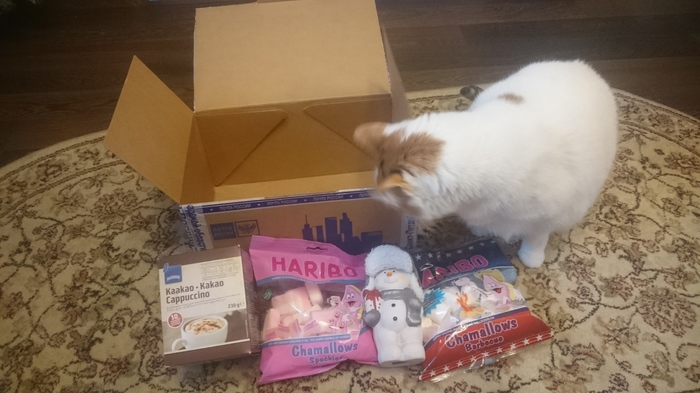 Внутри оказались любимые мармышки-зефирки, какао для тёплых и уютных зимних вечеров, прелестный снеговичок и письмо от Самого Санты с извинениями в задержке отправки и тёплыми пожеланиями!