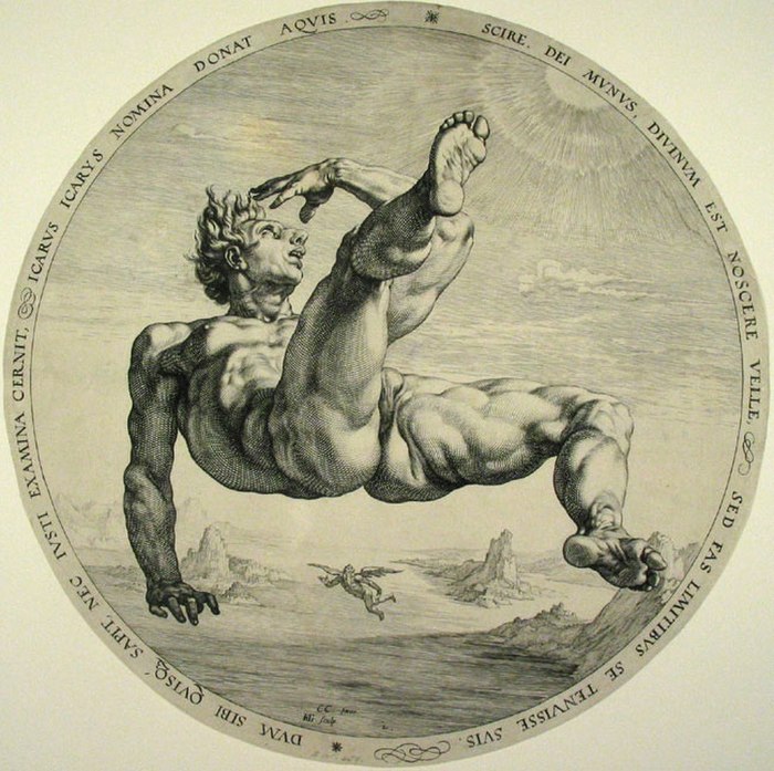 И еще немного, совсем потрясное: серия гравюр “Четыре падения”, изображающие четверку наказанных за свое высокомерие персонажей древнегреческих мифов, Тантала, Икара, Фаэтона и Иксиона. Созданы эти гравюры были по наброскам Корнелиса ван Харлема и тут, конечно, Гольциус разгулялся - невероятно мощные фигуры, дрожащие от напряжения мускулы, спирали облаков подчеркивающие движение. Что самое тут прикольно - это то, что будучи собранными вместе фигуры на гравюрах (кстати, в примерно одинаковых позах, но нарисованные под разными ракурсами) тоже создают что-то вроде спирали, то есть художником было задумано, что вы их рассматривать будете одновременно: