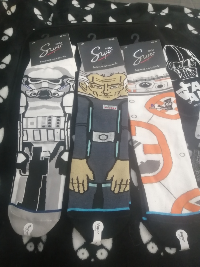 Носки. Таких крутых носков давно не видел! У меня есть разные носки забавные, но к ним ещё прибыло пополнение в виде Таркина, штурмовика и BB-8