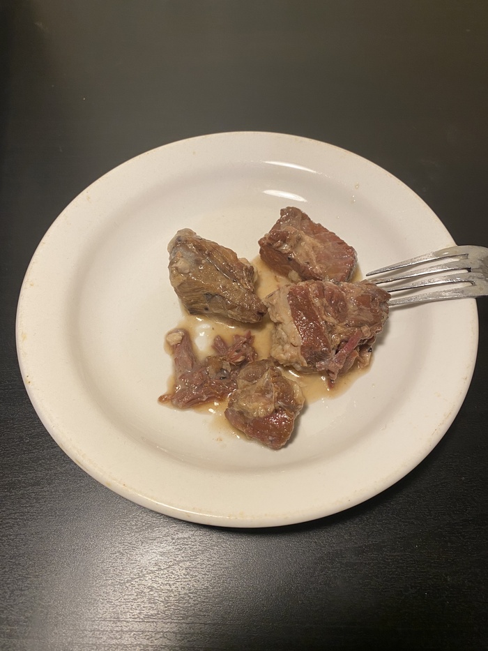 Подруга посмотрела, сказала "это что, жилы в самом большом куске? Я их не буду - буду маленький без жил". ИМХО жилы это сок, мягкость и вкус - они должны быть, и я такому кусочку порадовался. Однако в видео с ютуба слышал, что жилы расходятся на желе, и их вообще в тушенке будет незаметно. Скажу, что жилы имели "на донышке" остатки своей жилистой природы - форму и цвет сохранили, но таяли во рту - однозначный респект! Самое, конечно, страшное опасение было в том, что жилы будут как в магазинной тушенке - простыни, которые невозможно ни откусить, ни прожевать. Нет, не как в магазинной, очень мягко и хорошо.