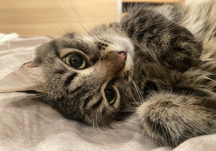 У нее оказалась интересная шуба, ее не назвать мягкой или пушистой, это именно плотный жесткий мех. Есть жесткошерстные собаки, а кошки жесткошерстные бывают? Вот у нас такая есть. Лапа любит смотреть с нами мультики и яркие игры, а спит теперь в лежанке у нашего изголовья. Она так и не стала такой же контактной, как наша приютская Мася, и, видимо, уже никогда не придет, как Мася, лежать к нам на грудь.