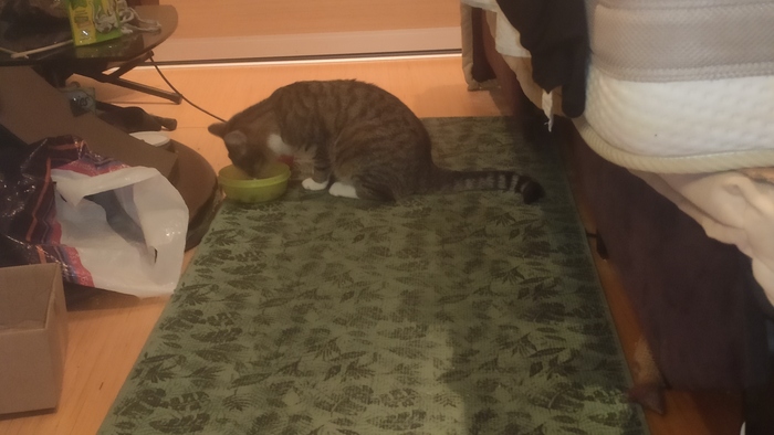Следующий месяц мы аккуратно и поступенчато реализовывали этот план. Во-первых, миски с кормом постепенно передвигаются из-под кровати наружу. Хочешь есть – высовывай голову в мир. И Лапа начала выходить, но только по ночам, думая, что ее никто не видит. Первый успех попал на фото поздним вечером 5 ноября. Лоток выставлять наружу мы пока не рискуем – я бы на месте Лапы в этом случае сказал бы себе – “а так ли мне нужен ваш лоток?”.