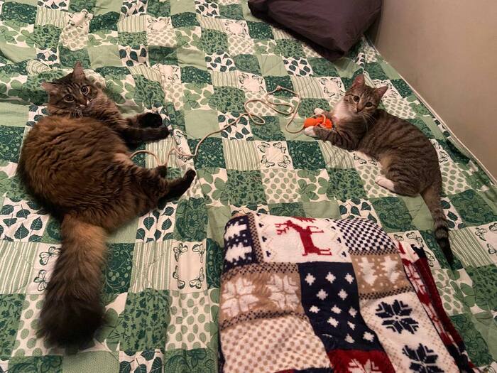 Вот это она затарахтела! Однако мы знаем, что громкое урчание у кошки – далеко не всегда признак умиротворения. Это может быть и признаком сильного стресса или боли, когда кошка урчанием пытается успокоить сама себя. Поэтому мы продолжали внимательно следить за Лапиным психологическим состоянием, не навязываясь, а лишь поддерживая ее попытки социализации. Ну и все добавляя под кровать новые коробки, пока от бывшего пространства ей не остался лишь небольшой уголок. Это возымело действие, и к концу ноября Лапа уже начала все чаще прогуливаться по спальне даже в нашем присутствии. Мы снова начали потихоньку знакомить кошек друг с другом. Те полтора месяца, что Масю не пускали в спальню, сыграли хорошую службу – эта территория теперь воспринималась скорее как Лапина. Тем не менее, социализация проходила непросто.