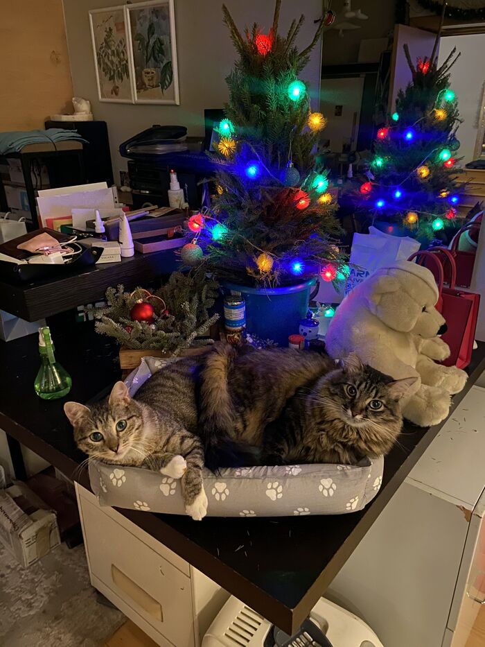 Так мы и встретили Новый Год, и только в этот момент, аж через 3 месяца после того, как мы взяли домой это белолапое чудо, мы смогли выдохнуть и убедиться, что в целом все проблемы остались позади. Лапа научилась успокаивать себя не только через урчание, но и через ритуалы, то есть через повторяющиеся маршруты по дому и так называемые “точки сохранения” – ряд особенных для нее мест (зон в квартире, коробок, лежанок), в которые она приходит, бухается туда и становится там настолько спокойной, что ее там даже можно погладить. Отдохнет – и побежит барагозить дальше. У нее есть особенный диван, на который она запрыгнет, сделает по нему именно столько кругов и только после этого начнет драть тот самый “ее” плед с оленями, который специально для нее всегда лежит там, а не где-либо еще. Это ее самый явный ритуал.