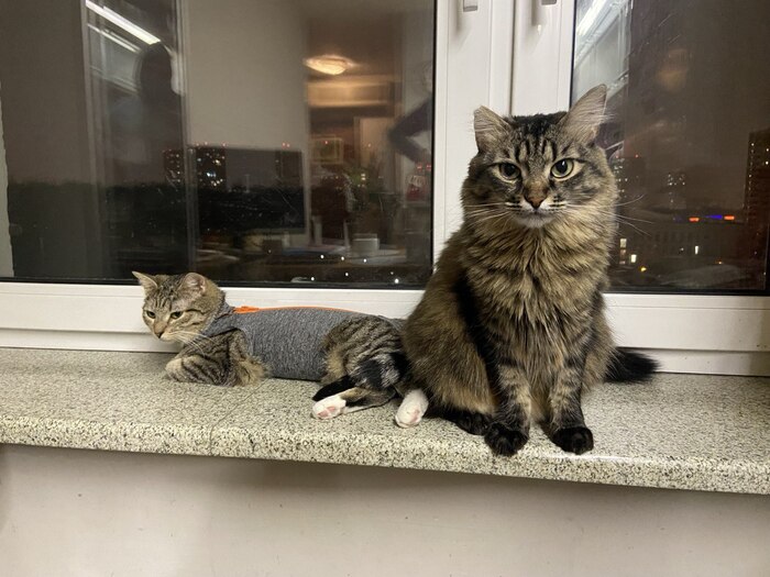 Но основной причиной ветеринарного обследования стали ее непрекращающиеся течки. Мы поняли, что ее первое громкое урчание под кроватью в ответ на ласку могло быть признаком возобновления течки после перерыва, вызванного стрессом. Однако нам не удавалось поймать промежуток между течками, в который следовало бы выполнить стерилизацию – эти эпизоды у нее шли один за другим. В итоге ветеринар принял решение стерилизовать ее как есть. Вмешательство прошло успешно, и благодаря усиленному шву и вот такой модной попоне Лапа уже в день операции, едва отойдя от наркоза, уже скакала по всему дому.