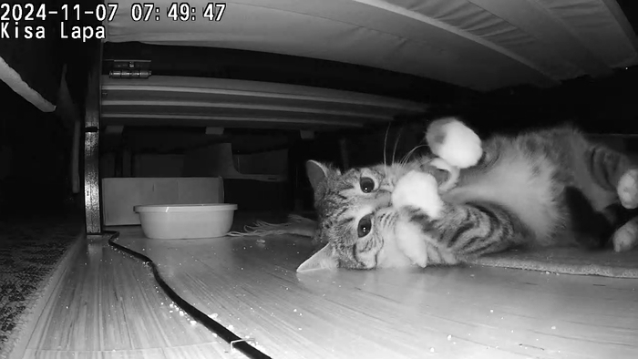Через несколько дней Лапа немного оживела, перестала воспринимать нас хотя бы как экзистенциальное зло, и с ней уже можно было иногда играть длинными предметами, без непосредственного участия рук. Но оставался вопрос с тактильным взаимодействием. Для его решения я начал постепенно закладывать под кровать пустые коробки, ограничивая ей пространство там таким образом, чтобы она все чаще могла оказываться на расстоянии моей вытянутой руки. Мы подолгу лежали у кровати, разговаривая с Лапой и аккуратно поглаживая ее. И к середине ноября начало происходить вот это.