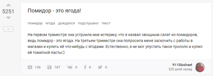 под картинкой: (текст: Сначала она устроила мне истерику из-за того, что я назвал овощным салат из помидоров, ведь помидор - это ягода. Спустя какое-то время она попросила меня заскочить с работы в магазин купить ей что-нибудь с ягодами. Естественно, я не мог упустить такое «трололо» и купил ей томатной пасты.)