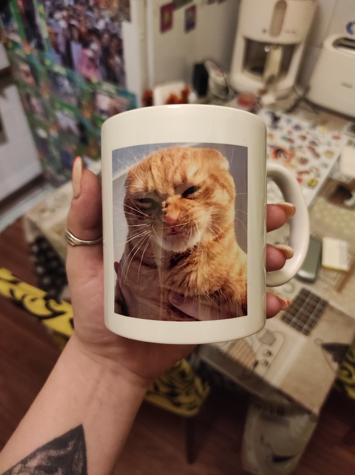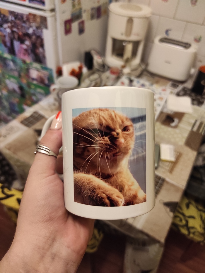 Я просто не смогла пройти мимо этой прекрасной недовольной моськи и в итоге решила сделать себе кружку) В ней получается идеальный утренний кофе- ты просыпаешься с недовольным лицом, идешь на кухню, берешь чашку, с которой на тебя смотрит с недовольной мордой кот и становится проще, ведь ненавидеть утро приятнее на пару с кем-то)