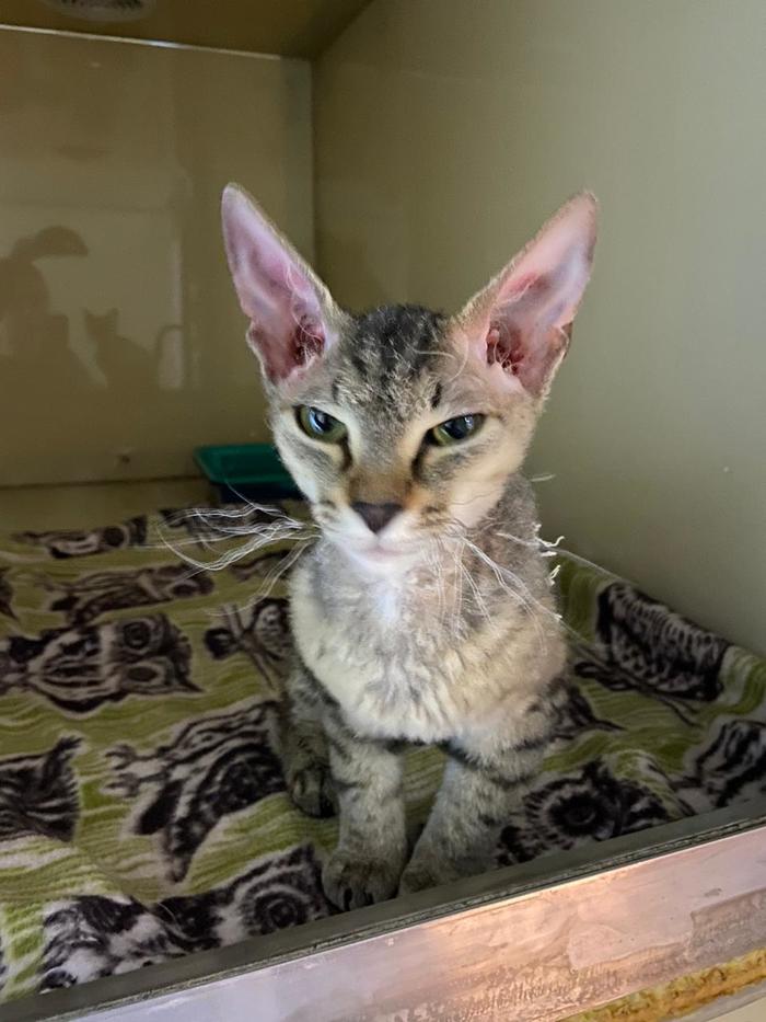 Всем привет. В прошлый четверг (12 ноября) возле дома на улице Милашенкова, 13к1 (Москва) жене под ноги с громким мяуканьем бросился котенок. На спине кошака была страшная рана, как будто оторван кусок кожи и прилеплен обратно. Конечно, котенка забрали домой, накормили и в дальнейшем отвезли в ветеринарную клинику. Котенок оказался породистый, корниш рекс, девочка. Мы ее назвали Анфисой. В клинике взяли анализы (обнаружили ушного клеща, в остальном все хорошо) и обработали рану. Анфиска домашняя, людей не боится, очень активная и ласковая.