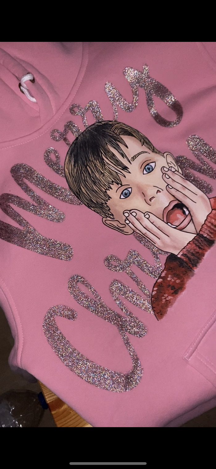 И вроде тут я хотела остановиться, но работа показалась неполной и я решила добавить надпись на фоне. Решила это сделать краской с блестками, чтобы толстовка получилась очень атмосферной и праздничной.