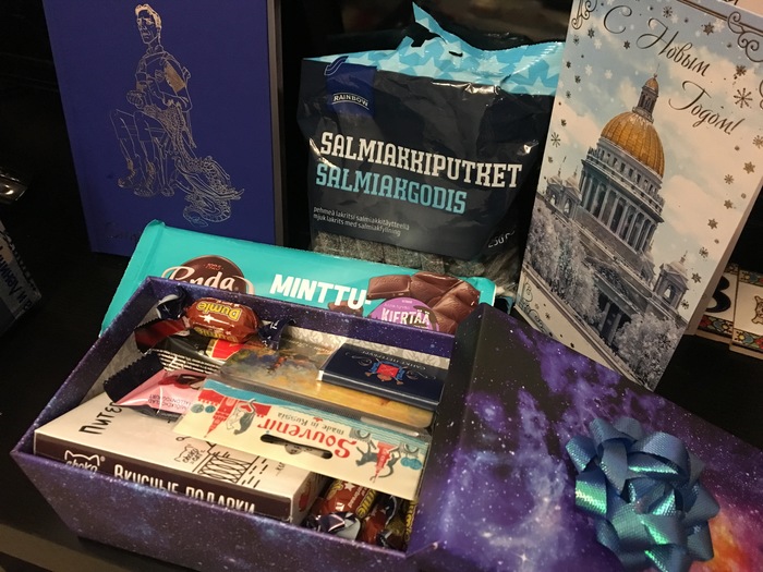 Классная книга, лакричные конфетки, и космическая коробочка со сладостями.