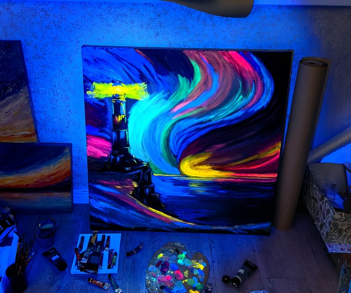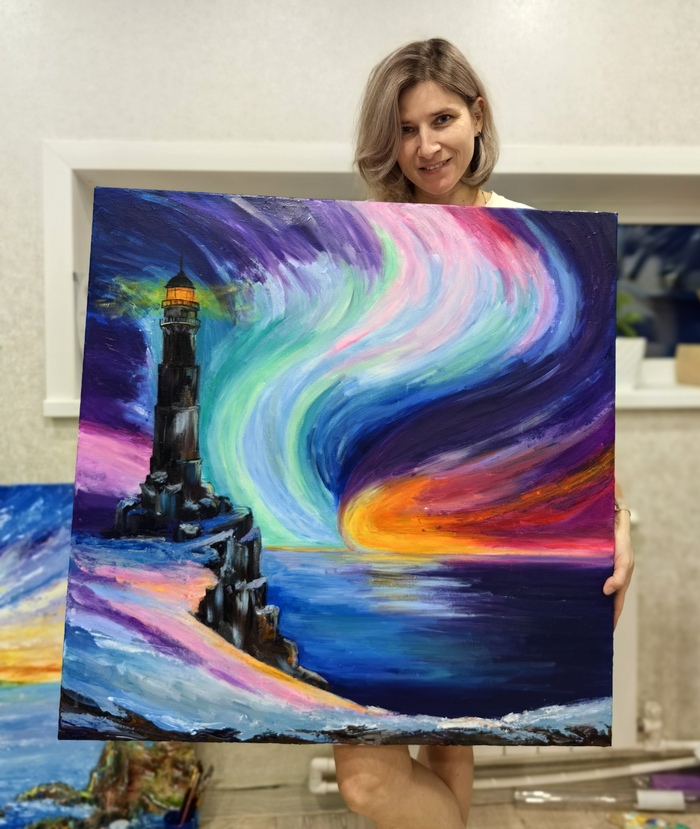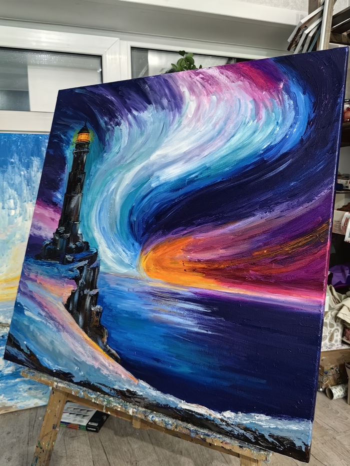 В этот раз я писала картину акриловыми красками. Размер холста 80х80. Так картина выглядит при обычном свете)