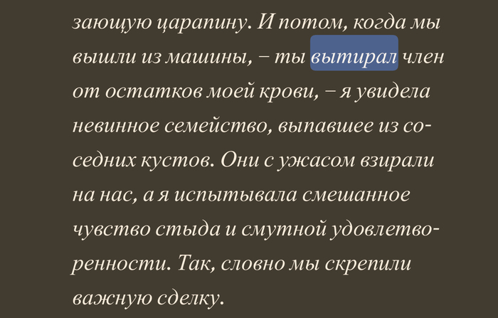 Как вишенка на торте - автобиографичность произведения, подтверждаемая жанром автофикшн и почти полным совпадением историй и любимых стихов из профиля Пикабу с фрагментами книги. Что объясняет все стремления автора всячески оправдать и возвысить героиню, переиграв здравый смысл.