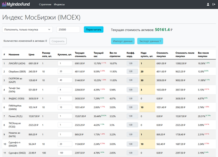 Сервис сделает перерасчёт и напишет какие акции и сколько штук надо купить. Имейте в виду, что расчет идет только целыми лотами, неполные лоты не учитываются в расчётах.