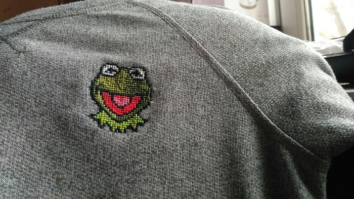 После пары десятков значков захотелось попробовать вышить что-нибудь подобное на одежде. Очень долго искала водорастворимую канву, но в итоге нашла. Но первый блин, как говорится, комом. Три раза распарывала вышивку, нитки вечно путались, строчки шли криво. Я не очень умная и не сразу догадалась, что нужно просто было взять нитки и иголку потоньше... :с