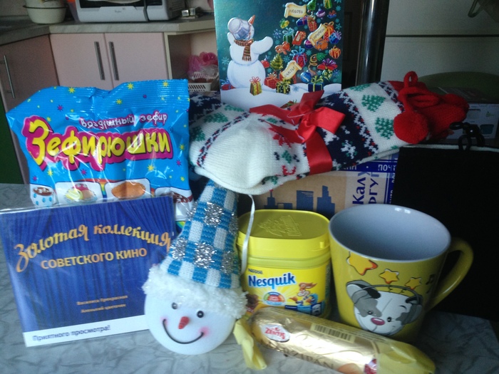Моим Дедом Морозом оказался пикабушник Юрий из города Обнинска. В коробке оказались самые новогодние ништяки - открытка с лучшими пожеланиями, банка Несквика и Земфирюшки к нему, милая кружка, чтобы пить какао, любимый мамин марципан, СУПЕР-КРУТЫЕ НОСКИ С ОЛЕНЯМИ (я прям дико от них прусь и хожу в них каждый день, я так их хотела, ееееееееееееее), мягенький чехол для телефона, диск с любимыми Советскими мультами и светящийся всеми цветами улыбающийся снеговик для неувядающего новогоднего настроения)))