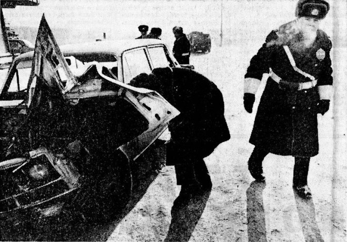 Когда мы приехали в 6-е отделение ГАИ, заботам которого поручен самый опасный кусок дороги, от Калужского шоссе до Ленинградского, нам не пришлось долго ждать, чтобы убедиться в правоте статистики. Автоавария с тяжелыми последствиями произошла возле моста через Киевскую железную дорогу. Пострадавшего, водителя «Жигулей» И-87-44 МТ, мы на месте уже не застали. Со множеством переломов ребер и сотрясением мозга его увезла «скорая». Жалко выглядит новенькая «шестерка», прошедшая меньше 20 тысяч километров. Стрелки часов в кабине показывают 9.20. Они остановились в тот момент, когда машина, ехавшая, по словам свидетелей, не так уж быстро, примерно 60 километров в час, круто развернулась боком и вылетела на встречную полосу под колёса «КамАЗа». Затем отлетевшую легковушку поддал «МАЗ», превратив «Жигули» в мятую жестянку.