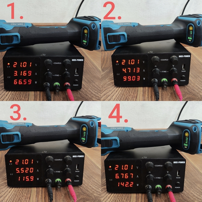 Минимальное напряжение работы 14 вольт, обусловлено защитой от переразряда и перегруза. Первый режим работы в холостую потребляет 66W, второй 99W, третий 115W, четвёртый 142W при напряжении 21V. Первые три режима подходят для зачистки металла, или резки мягких материалов, четвёртый режим подходит для резки металла. Болгарка в меру шумная, после отключения останавливается довольно быстро, тянет более чем приемлемо. Стоит заметить, что тяга и мощность напрямую зависит от заряда и качества аккумулятора...