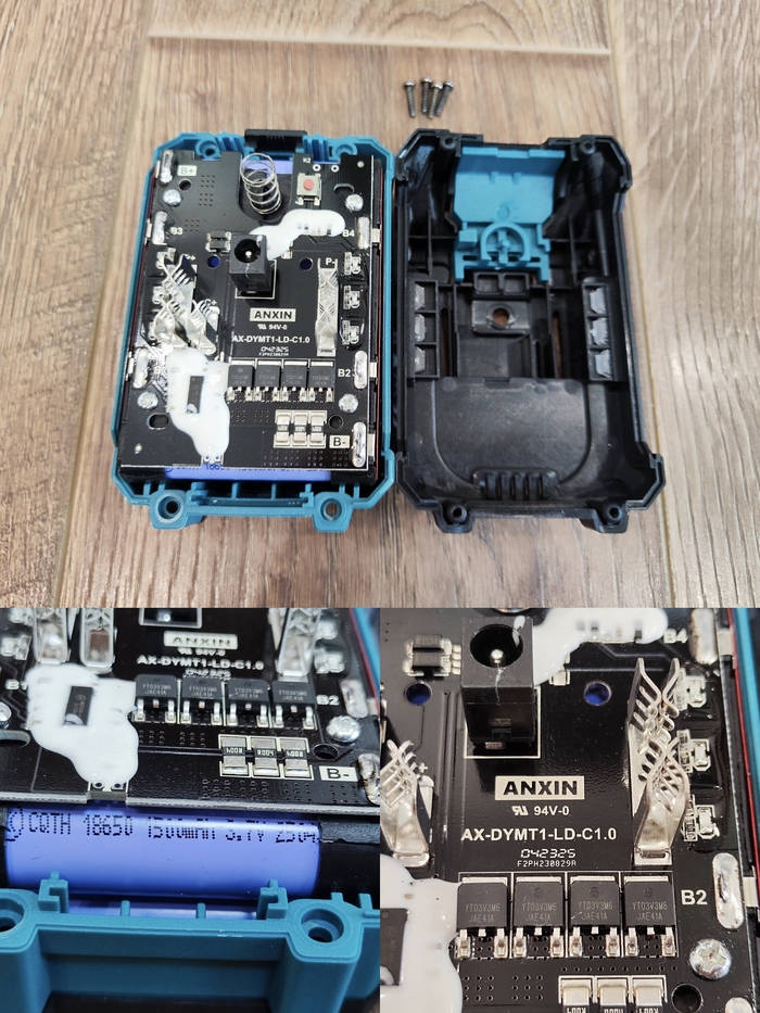 Пломб на аккумуляторе нет, собран на 4х винтах под крестовую отвёртку. Заявленные характеристики буквально нужно делить на два. Ячеек 18650 в аккумуляторе 10шт. Собраны по схеме 5s2p. Что даёт диапазон напряжения от 3*5=15V до 4.2*5=21V(среднее выходит 18V. Ёмкость одной ячейки составляет около 1500mah, что благодаря дублирующим ячейкам складывается в ~ 3000mah(3Ah), 3Ah*18V=54Wh. К сожалению, этой ёмкости хватает на 5-10 минут работы в щадящих условиях, что слишком мало для мобильного инструмента. Может быть время зарядки компенсирует небольшую ёмкость батареи?