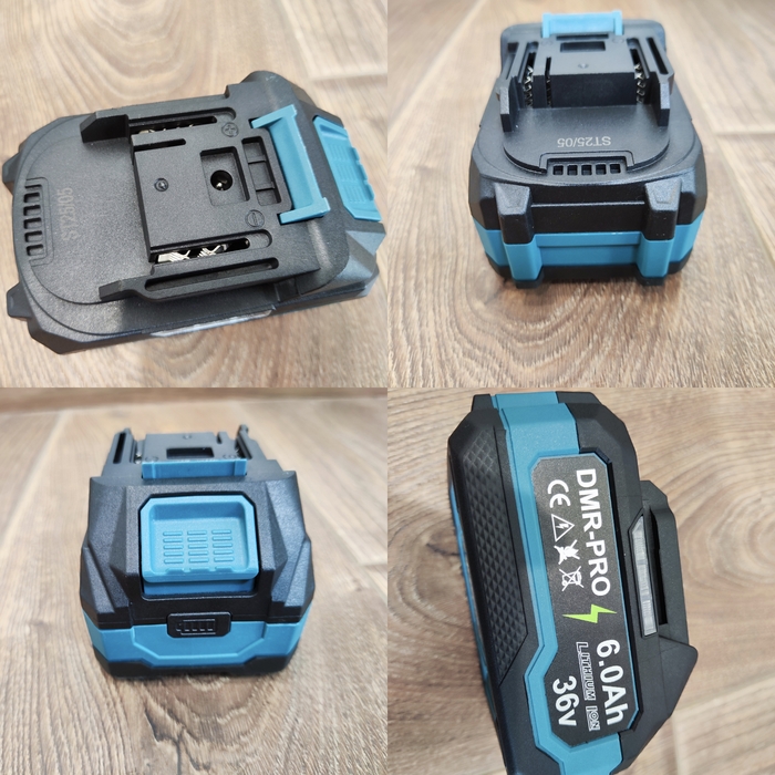 Корпус аккумулятора мне понравился, прорезиненный, в цвет болгарки, пластик толстый, прочный. Слегка болтается в посадочном месте болгарки, т.е сидит не плотно. Индикация заряда по бокам при нажатии фиксатора - удобно и красиво. Индикатор заряда под фиксатором отсутствует, стоит заглушка. Полярность подписана. Есть коннектор для зарядки.