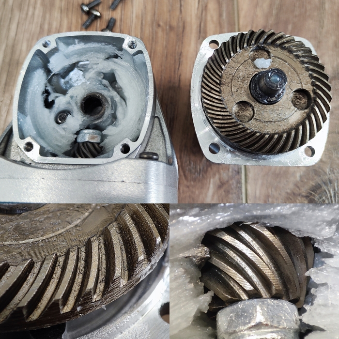 Корпус редуктора состоит из двух половин, соединённых четырьмя винтами под крестовую отвёртку. Шестерни металлические, обработка грубовата, но более чем приемлема. Смазка показалось какой-то странной, образует что-то типо волокон. Я бы заменил на специализированную. В работе на холостую, без диска и гаек, показалось, что вибрирует сильнее чем должна. Ведомая шестерня отдельно от ведущей вращалась не так свободно как хотелось, с каким-то небольшим "постукиванием". В свою очередь включение болгарки без ведомой шестерни вибрацию исключило практически полностью.