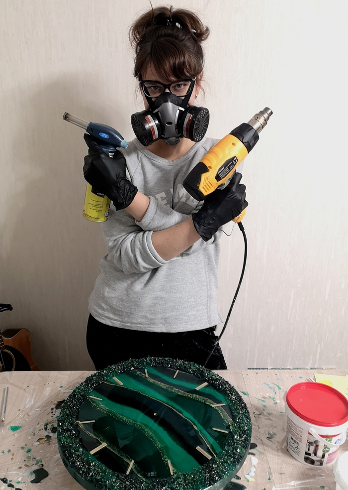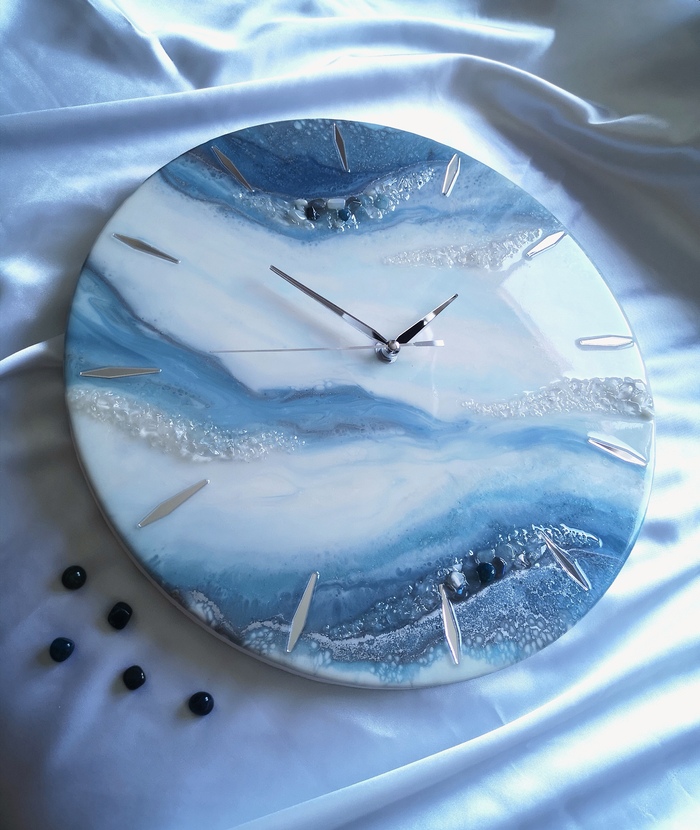 На видео все просто и быстро, на деле есть миллион нюансов. В общем красиво получилось раза с десятого. Но, что со все этим добром делать? Выкинуть жалко, попробовала выставить на барахолку за очень низкую цену и покупатели нашлись. Далее пол года примерно я смотрела сотни уроков, мастерклассов и тренировалась. Моё мастерство росло вместе с ценами на мои изделия. Но все равно я всегда была чем-то не довольна, у других мастеров было лучше. Конечно, друзья и родственники говорили, что все вообще огонь, но они то не видели такого количества офигенных работ, как я. Переломный момент настал, когда я выложила в инсту фото часов с пометкой магазина, где я покупала стрелки и деления для них. Магазин, к слову очень известный, самые крутые мастера затариваются там. Вот на следующее утро мне пишет менеджер этого магазина с просьбой разрешения выложить мою работу у них на странице. Вот это я, конечно, офигела. Нет ОФИГЕЛА! Мою работу рядом с работами именитых гуру эпоксидки, моих кумиров!!! Конечно я дала разрешение и мои часы выложили с подписью "от мастера из Беларуси". Видели, видели?? МАСТЕРА! Это я что-ли? Я наверное ничем так не гордилась, как этим событием.
