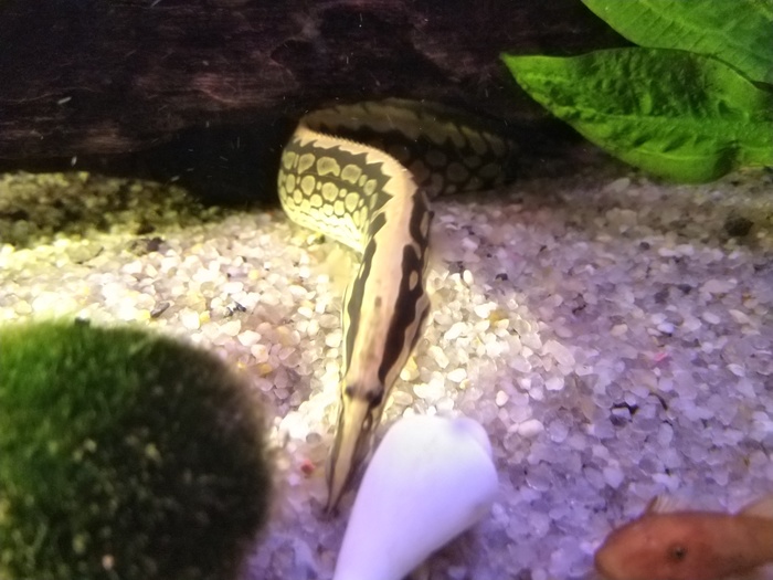 В зоомагазине мне его втюхнули полгода назад, когда я запустила аквариум и пришла за рыбами. Продавец на голубом глазу пообещал что с неонами в соседях ему вообще норм и 50 литров это самый самолёт, больше не надо. Разнообразие фауны, ага. Выглядел он мирно - червячок в пять см длиной и толщиной в карандаш, которого эти самые неоны гоняли в хвост и в гриву. Он им потом отомстил - сожрал всех.