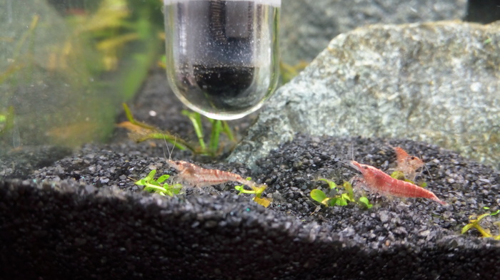 По мере установления баланса в аквариуме должны произойти бактериальная вспышка( белый налет на корягах, растениях, который потом просто исчезнет) и рост NH3/NH4, затем начнут расти NO2, после NO3. Только когда NH3/NH4/NO2 станут 0, можно запускать треть от проектного количества обитателей. В моем случае огромного скачка аммиака не было, плюс выросли нитриты, потом практически исчезли. Я подумал все, пора. Первооткрывателями стали креветки - вишни (после 5 дней все живы, пожрали бактериалку всю). После запущены три расборы гетероморфы.